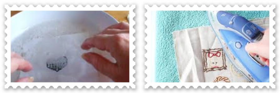 - Remove stitched piece from the water. DO NOT WRING but try to remove excess water from the piece by squeezing it with your hands