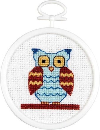 Description 18 count cotton Aida fabric, 6 strand corded cotton floss, needle, graph and instructions and self adhesive mounting board Finished picture 2.5 inch round